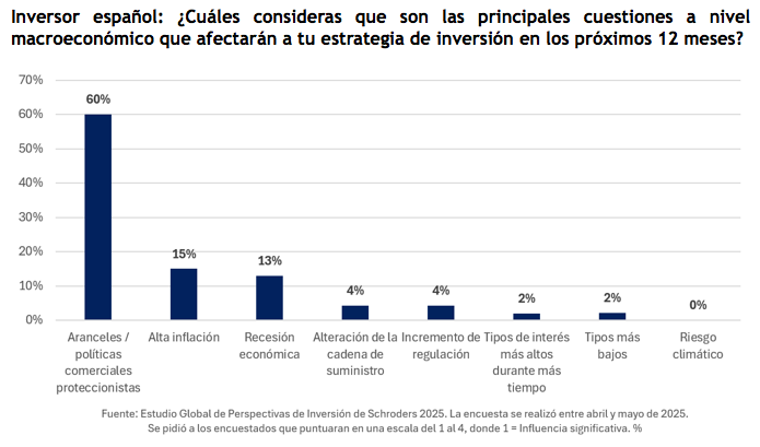 2. Los aranceles son identificados como la mayor preocupación a nivel macroeconómico, tanto para los inversores españoles como para los globales (60% y 63%, respectivamente). Además, los españoles también temen: