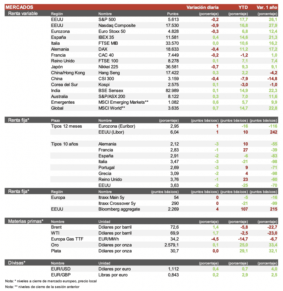 En una jornada con escaso volumen en las bolsas europeas, destacamos las caídas de ASML e Infineon en línea con el sector de semiconductores de EEUU, los dos valores que más caen del Euro Stoxx 50. En España, las mayores subidas las registran Enagás, Puig Brands y Rovi, valores con un comportamiento negativo en sesiones recientes, mientras que por el lado negativo se encuentran: Grifols, Unicaja e Indra. Hoy Expansión lanzaba la noticia de que Brookfield estaría buscando levantar 2.000 millones de euros para cerrar la OPA a Grifols por un valor para las acciones A de 11€ por acción, y buscar un descuento sobre las acciones B. Una oferta que parece complicado que sea aceptada por los accionistas.