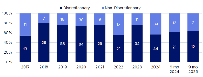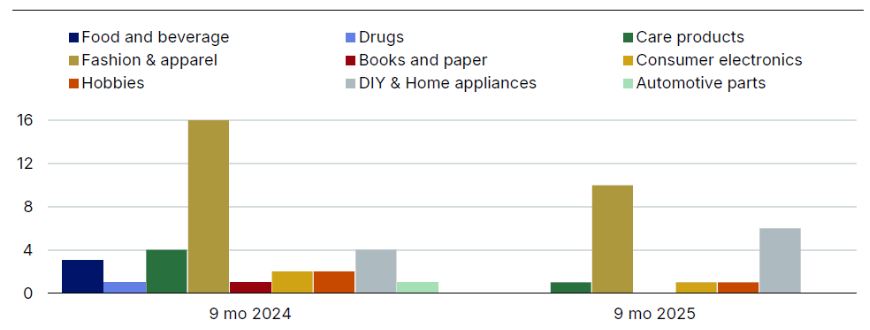 La composición sectorial de las quiebras muestra vulnerabilidades no discrecionales   A pesar de la disminución general de las tasas de impago, la mayoría de las quiebras siguen produciéndose entre los minoristas no discrecionales, especialmente en el segmento de la moda y la confección.   Esta concentración refleja varias presiones estructurales y cíclicas: