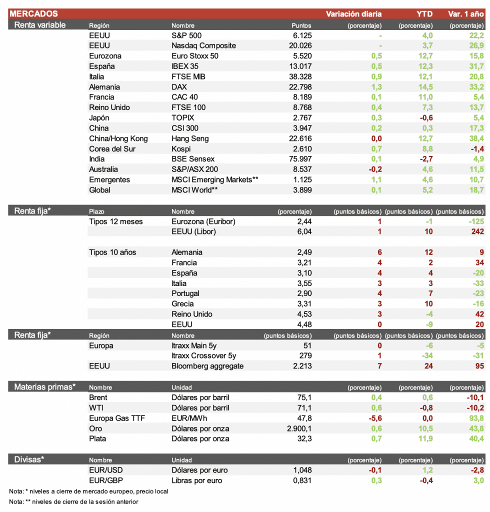 En la región Asia-Pacífico, el mercado ha prolongado sus subidas tras los fuertes avances de la semana anterior. En China destacamos la reunión del PCC junto a varios emprendedores y empresas en las que destacaban figuras como la de Jack Ma o la empresa DeepSeek, que el mercado interpreta como una muestra de mayor apoyo gubernamental al sector privado después de unos años de represión regulatoria. El Hang Seng de Hong Kong ha cerrado plano y el índice de Shanghai ha subido un 0,3%. En Japón, el TOPIX ha cerrado con una subida de 0,28% y el KOSPI del 0,75%.