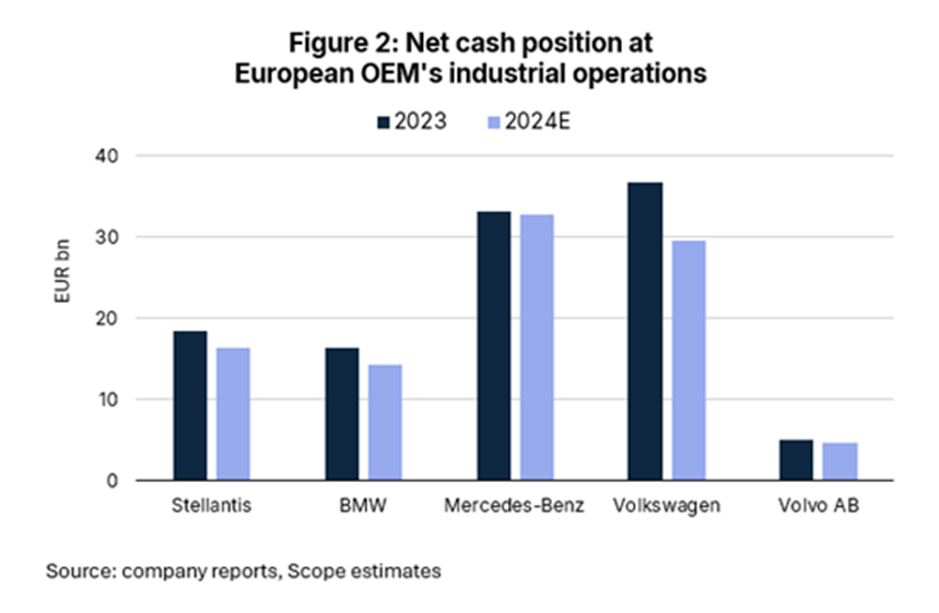En el lado positivo, observamos que los OEM europeos entrarán en 2025 con sólidas posiciones de tesorería neta en sus operaciones industriales gracias a los fuertes flujos de caja de años anteriores. También prevemos menores desembolsos a los accionistas en 2025, lo que podría ayudar a preservar la flexibilidad financiera en medio de todos los retos (Gráfico 2).