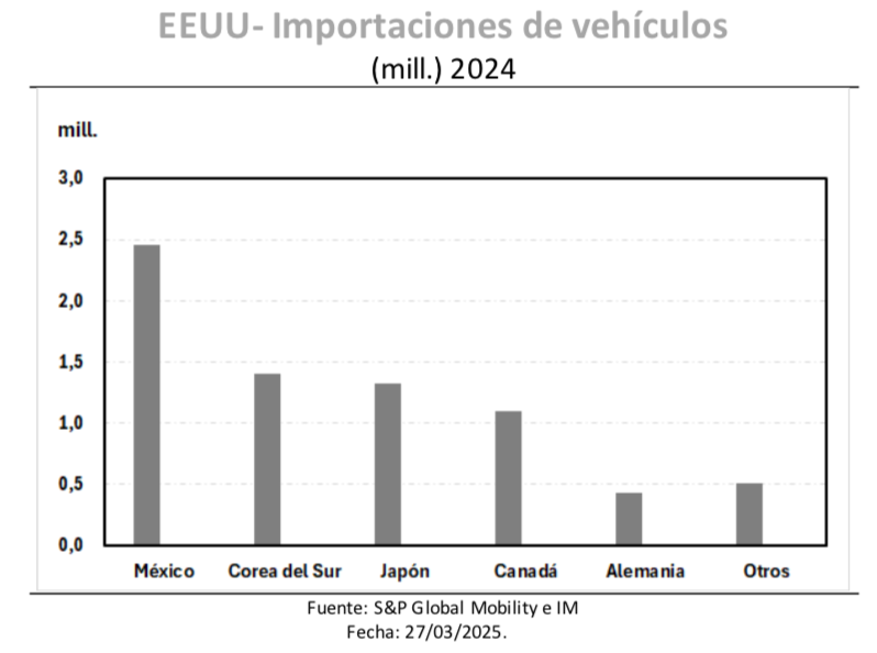 En la medida se contempla que los importadores que estén adscritos al acuerdo USMCA podrán certificar su contenido estadounidense, y el arancel del 25% solo se aplicará al valor de los componentes no fabricados en territorio americano. Más allá de sus vecinos, los productores asiáticos de Japón y Corea del Sur son especialmente sensibles, debido al escaso contenido de material americano. Como es lógico, es difícil establecer una medición exacta, pero podría afectar en torno a 500.000 millones de dólares en vehículos y componentes lo cual es medianamente acorde con las cifras de la Casa Blanca, que prevén ingresos de 100.000 mill. En este sentido, más de la mitad de los vehículos de pasajeros nuevos vendidos en Estados Unidos en 2024 se ensamblaron fuera del país.