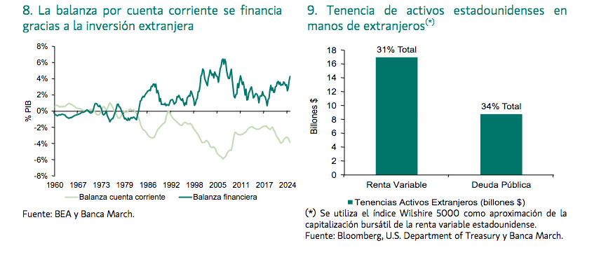 En el caso de Estados Unidos, si bien es cierto que arrastra un déficit por cuenta corriente histórico, su cuenta financiera disfruta de superávit (gráfico 8). Su economía es especialmente atractiva para los ahorros externos porque sus activos son seguros y rentables. Este flujo de capital extranjero permite así una mayor inversión, mayor consumo y con ello impulsa el crecimiento estadounidense.