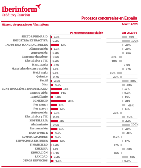 De acuerdo con el seguimiento de los procesos concursales publicados en el BOE que realiza Iberinform, el tejido empresarial registró en marzo un aumento interanual del 40% de las insolvencias empresariales. En el conjunto del año acumulan un incremento del 18% con respecto al mismo periodo de 2024.