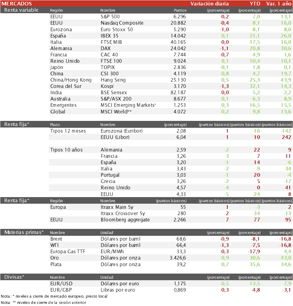 Así, la TIR del Bund a 10 años ha descendido 2 p.b. hasta el 2,59%, al igual que la yield del Treasury a 10 años que desciende 5 p.b. hasta un 4,33%.