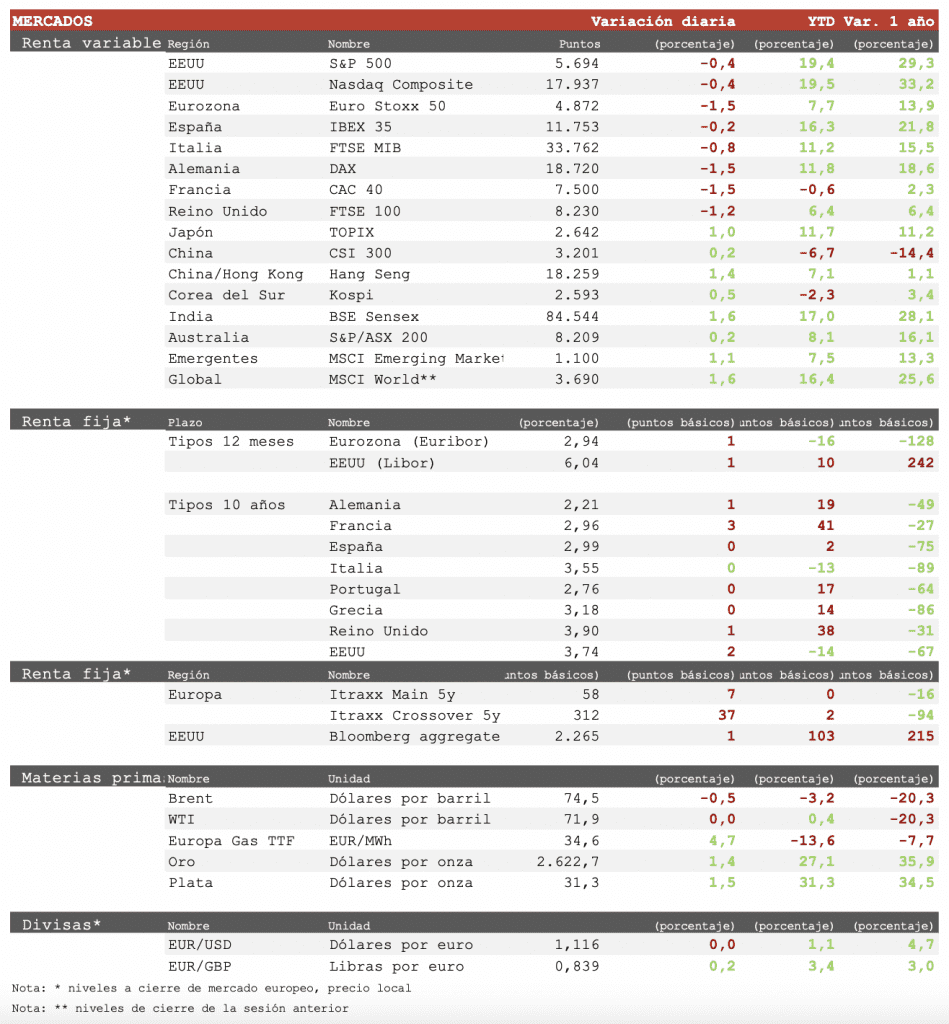 Nicolás López (Singular Bank) | Jornada de descensos en los principales índices europeos que han perdido las ganancias de ayer tras la decisión de la Fed de bajar 50 pb sus tasas oficiales. Los sectores más ligados a la economía china como lujo y autos lideraron los descensos. El Ibex 35, con baja exposición a China, ha cerrado con una ligera caída de un 0,11%, mientras el Euro Stoxx 50 ha perdido un 1,45%. En el conjunto de la semana los índices europeos han rebotado en torno a un 1%, recuperando las caídas de la primera semana del mes, pero se mantienen por debajo de los máximos de julio.