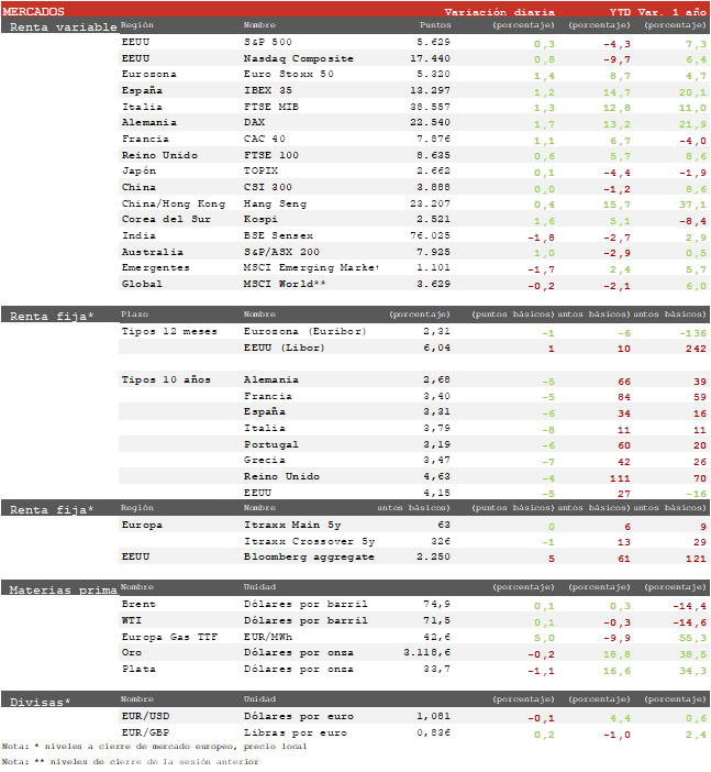 En la región Asia-Pacífico se ha registrado un tono mayoritariamente alcista con la principal excepción del Sensex indio, que ha visto frenado su rebote cercano al 7% desde comienzo de marzo. El resto de los mercados han rebotado ligeramente gracias a la recuperación de Wall Street del día anterior a la espera del anuncio de los aranceles. En este contexto, el Topix japonés se ha mantenido plano y el Hang Seng hongkonés ha repuntado un 0,38%.
