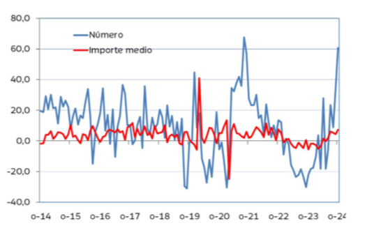 Santiago Martínez Morando (Ibercaja) | Según la estadística que publica el INE a partir de los datos de los registradores, en octubre creció un llamativo 60,8% interanual el número de hipotecas concedidas, un 7,1% el importe medio y un 72,5% el importe total concedido. Si tomamos los datos acumulados en los diez primeros meses del año, menos volátiles que los mensuales, nos muestran un crecimiento ahora ya significativo tras una recuperación tardía respecto a las compraventas, del 9,2% interanual en el número de hipotecas, el 1,4% en el importe medio y el 11,2% en el importe total concedido. En doce meses se han concedido 411.000 hipotecas por un importe de 59.163 M€ (importe medio 144.000€). La estadística de nuevos préstamos para compra de la vivienda del Banco de España, muestra una expansión del 13,2% interanual de enero a octubre y 62.329 M€ concedidos en 12 meses.