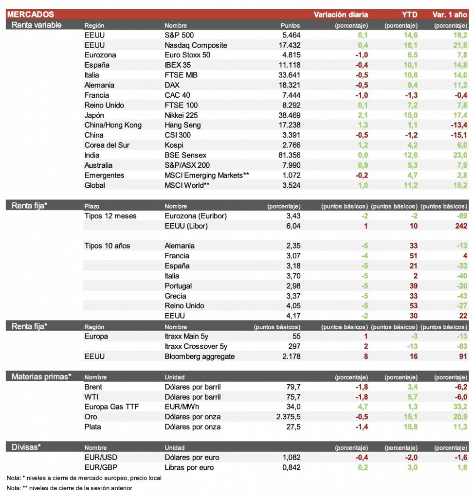 Álvaro Romero (Singular Bank) | Los principales índices europeos han registrado pequeñas caidas en el comienzo de la semana. El IBEX 35 ha caido un 0,1% y el Euro Stoxx 50 un 0,55% en una sesión sin referencias macro relevantes y en la que la atención se ha centrado en la publicación de resultados. El peor índice ha sido el CAC 40 francés que ha bajado un 0,7% lastrado por Stellantis y algunas compañías de lujo como Hermes o LVMH.