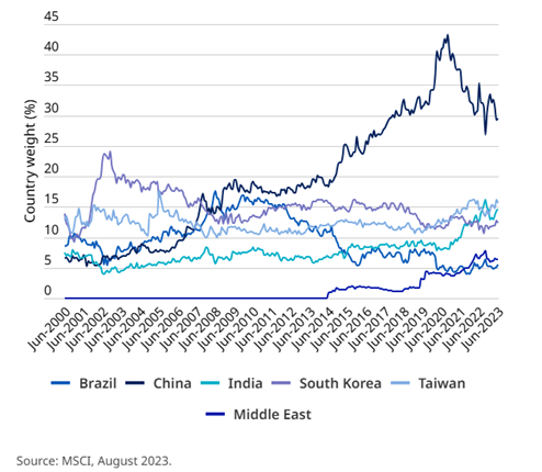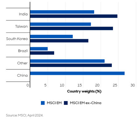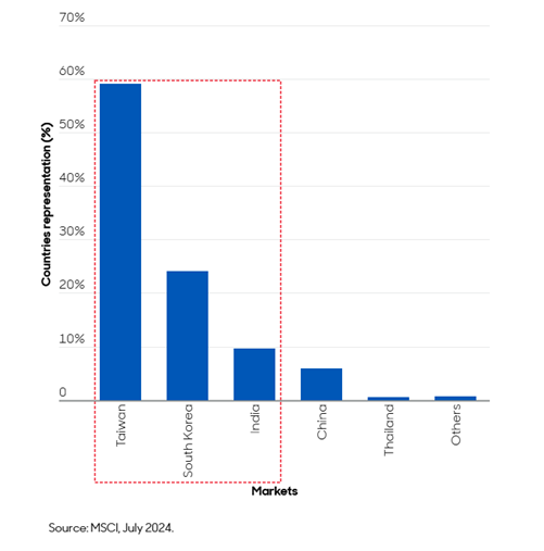 Hoy, el peso de China en el índice ronda el 24,4%. Aunque se ha reducido desde el 30% del año pasado debido a las fuertes ventas en el mercado, sigue estando significativamente por delante de India (19,9%) y Taiwán (18,8%) (gráfico 2) [4].