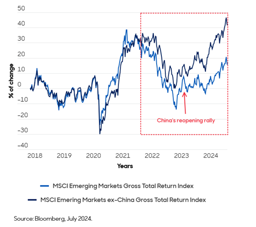 Varios factores estructurales a largo plazo proporcionan un viento de cola a los mercados emergentes sin China. Esta historia de crecimiento a menudo se pierde en el ruido de los rendimientos relativos intertrimestrales o interanuales.