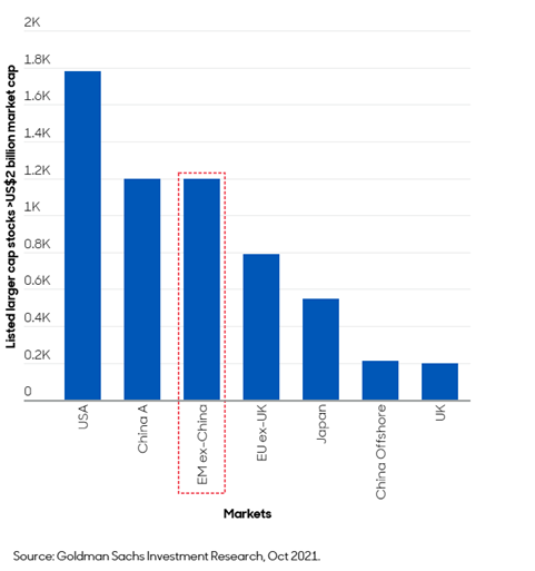 Los mercados emergentes sin China tienen una gran capitalización, lo que ofrece profundidad y liquidez. A finales de julio de 2023, los mercados emergentes sin China representaban casi la mitad de los componentes del índice MSCI EM (674 de 1.374 valores), pero el universo total en el que se puede invertir es mucho mayor [3]. Creemos que las oportunidades estructurales en los mercados emergentes sin China ofrecen un importante potencial de generación de alfa.