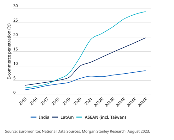 La rápida proliferación de las tecnologías digitales, respaldada por la abundancia de teléfonos inteligentes e Internet asequible, ha provocado un cambio sísmico en las pautas de comportamiento de los consumidores. Esto ha creado nuevos sectores económicos, como el comercio electrónico. Hemos asistido a algunos de los mayores cambios en el comercio minorista offline-online en la India, el Sudeste Asiático, Taiwán y América Latina (gráfico 7).