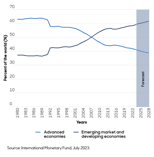 Nick Robinson y Alex Smith (abrdn) | En las tres últimas décadas, los mercados emergentes se han transformado radicalmente. Los mercados emergentes se han convertido en un motor de la economía mundial, aportando alrededor del 59% del PIB mundial total (en términos de poder adquisitivo) [1] (gráfico 1).