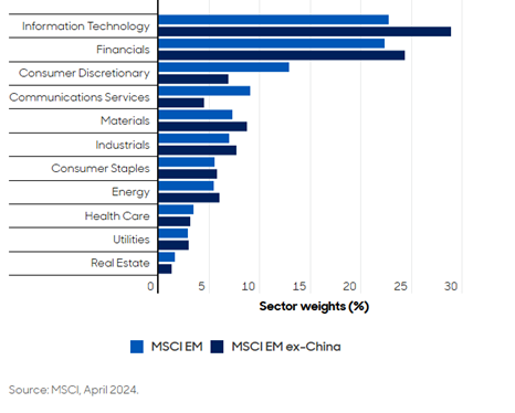 ¿Cómo es el universo de los mercados emergentes? El universo de renta variable emergente sin China no sólo ofrece exposición a otros mercados de alto crecimiento, sino también acceso a empresas que impulsan el crecimiento económico en diversos sectores. A diferencia del índice MSCI EM, ningún país o sector domina el índice de referencia, con mayores ponderaciones para varios mercados emergentes más pequeños, como Brasil y Arabia Saudí.