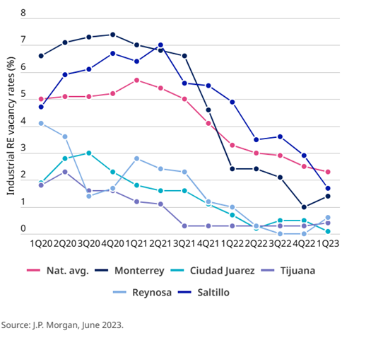 Gráfico 9: Con las tasas de vacantes comerciales cayendo, especialmente en el norte de México