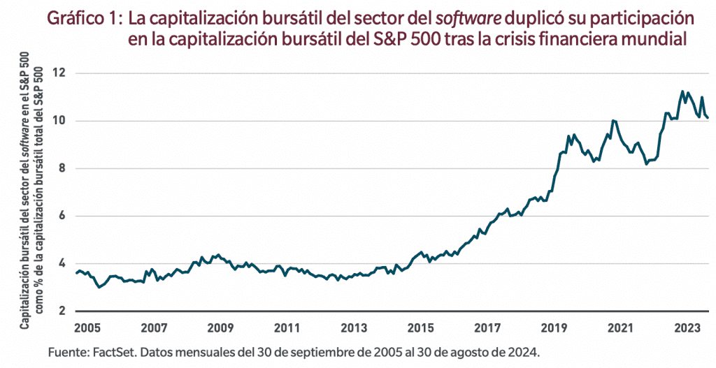 Con esa intención, centro esta edición de Strategist Corner en dónde estuvo el auge y dónde puede estar la caída.¿Dónde se produjo el auge y por qué? El ciclo económico que siguió a la crisis financiera mundial de 2008 se reveló dilatado pero débil, debido a la falta de voluntad de los bancos para conceder préstamos y de los consumidores y las empresas para gastar. Cuando las empresas occidentales no recompraban sus acciones o trasladaban la fabricación a China, asignaban recursos al sector del software. Este fenómenose tradujo en que el sector del software duplicó su participación en la capitalización bursátil del S&P 500.