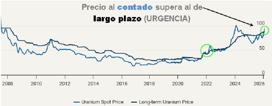 Según datos de UxC (una de las consultoras líderes más respetadas del mercado nuclear), así como de las declaraciones Presidente de Cameco y otros, entre el 66-70% de las necesidades totales hasta el año 2045 de las compañías eléctricas que gestionan reactores aún no han sido contratadas. Este proceso inverso ha provocado que los pasos intermedios hayan explotado al alza (el precio del enriquecimiento ha subido un 200-280% en solo tres años y la conversión un 200-250%) y el precio del ingrediente principal, el polvo amarillo, se haya quedado rezagado y solo haya subido un 75% en los últimos tres años.