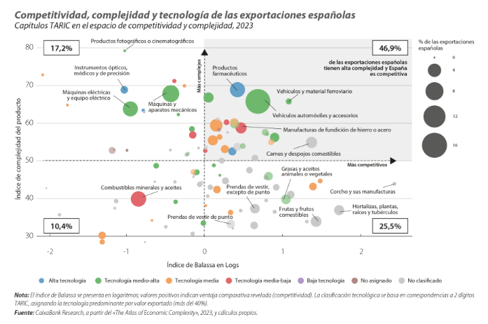 Anna Bahí Esteba (Caixabank Research) | Las tensiones geopolíticas y la incertidumbre de la demanda exterior nos obligan a reevaluar las fortalezas y debilidades de las exportaciones en la economía española. Para hacerlo, es esencial analizar qué exportamos, cuán diversificada es nuestra oferta y su competitividad. Para mejorar nuestra comprensión, en este artículo analizaremos la complejidad de los productos exportados, así como su intensidad tecnológica, dos variables clave para evaluar el grado de competitividad de nuestras exportaciones.