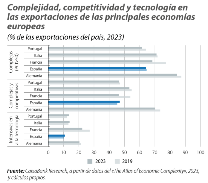 Aun así, España es la única economía del grupo que ha aumentado su competitividad en exportaciones complejas desde 2019. Además, junto con Italia y Portugal, ha incrementado el porcentaje de exportaciones clasificadas como de alta tecnología y su cuota de mercado en este tipo de exportaciones. Esto contrasta con la caída en la complejidad de los productos exportados por las principales economías europeas.