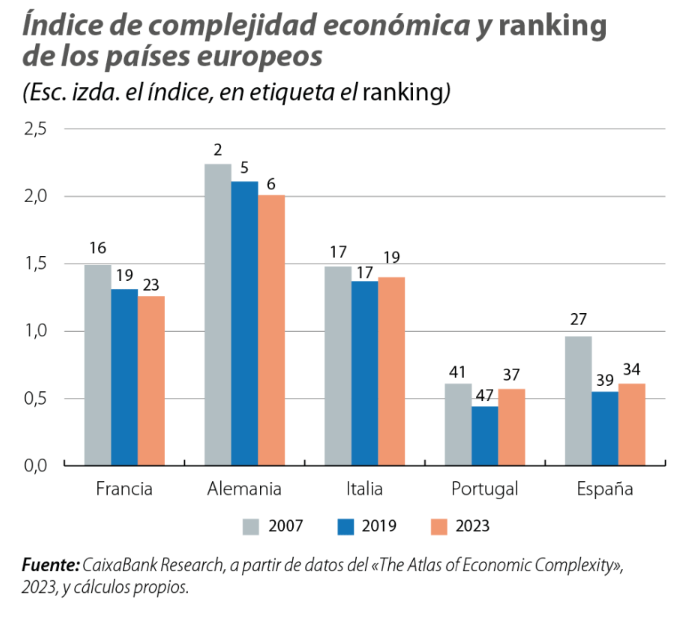 Si en lugar de observar la complejidad de los productos analizamos el ICE, vemos una tendencia descendente entre las principales economías europeas que se arrastra desde la crisis financiera (véase el tercer gráfico). Sin embargo, desde 2019, tanto España como Portugal han recuperado posiciones en el ranking. España ha pasado del puesto 39 al 34 y Portugal mejora del puesto 47 al 37. En cambio, Alemania, que en 2019 ocupaba la quinta posición (y que entre 1995 y 2016 se había mantenido en el top 4), cae al sexto lugar en 2023. Francia pierde cuatro posiciones y se sitúa en el puesto 23, por debajo de Italia, que cae dos posiciones y se sitúa en el 19.