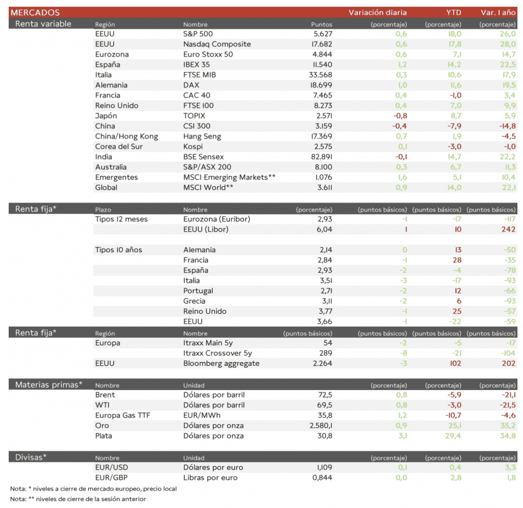 Para la Fed, el mercado estima que la Entidad realice un recorte de 100 pb en el conjunto de las 3 reuniones que quedan en 2024. No obstante, hay diversidad de opiniones después de que los datos de ayer mostraran que el índice de precios a la producción de Estados Unidos repuntó ligeramente en agosto y el aumento de las solicitudes de subsidio de desempleo reavivó la preocupación por el debilitamiento.
