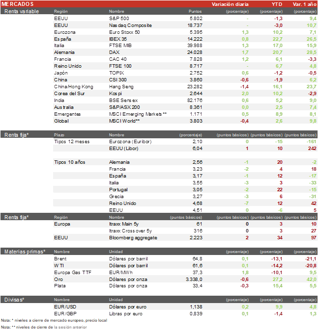 En España, el Ibex ha mantenido la inercia alcista provocada por la reunión telefónica entre EEUU y la Unión Europea, donde han acordado retrasar la entrada en vigor de los aranceles y darse tiempo para negociar. En España, las compañías más beneficiadas han sido ArcelorMittal (+4,3%), IAG (+3,13%) e Indra (+2,88%). La parte negativa ha recaído principalmente sobre el sector utilities, con bajadas alrededor del 0,3%, un sector que fue el más beneficiado la semana pasada tras conocerse la propuesta de aranceles del 50% a la UE por parte de Trump.