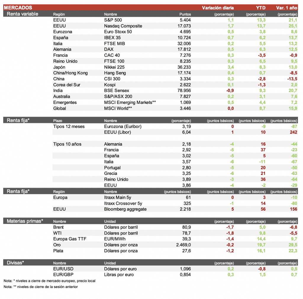 En España, la jornada fue positiva a pesar de la escasez de noticias relevantes, con los datos de la inflación de julio en línea con lo esperado. En el plano empresarial, continuamos viendo subidas relevantes en las compañías endeudadas ante el aumento de posibilidades de bajadas de tipos, Acciona Renovables es la empresa que más ha subido en el día (+1,9%) y Puig Brands la ha seguido tras varias sesiones a la baja. En la parte negativa se sitúa Grifols que ha caído un 5% tras publicarse en la prensa que la OPA de Brookfield podría complicarse por las cuentas de su filial China.