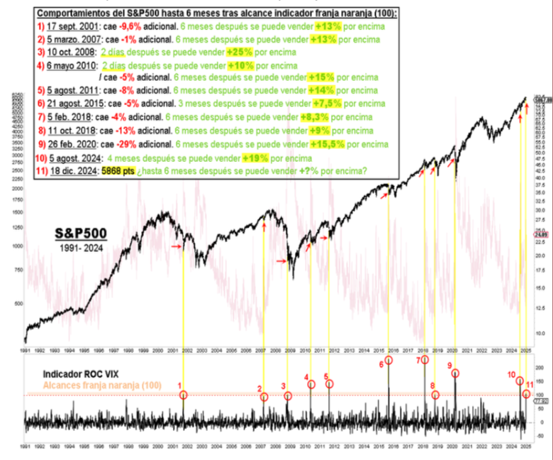 Renta 4 | En el gráfico inferior, estudiamos las reacciones del índice cuando el indicador negro sobre el VIX alcanza lecturas iguales o superiores a 100. Hasta la fecha, siempre, cada una de las veces en las que esto ha ocurrido, pese a que se hayan producido caídas adicionales, siempre se ha podido ganar (media 13,4%; mediana 13%) atractivas rentabilidades hasta seis meses después. Este indicador alcanzó 100 el pasado miércoles 18 de diciembre, en 5668 puntos. Un 10% de subida desde estos niveles andaría por niveles de 6230 puntos (nuevos máximos históricos, por encima de los del pasado 6 de diciembre en 6100 puntos).
