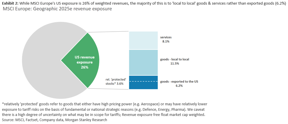 Morgan Stanley | Sólo el 6,2% de los ingresos ponderados del MSCI Europa mantienen una exposición a USA a través de bienes exportados desde Europa … y por lo tanto expuestos al riesgo de subida de aranceles (la mayor parte de la exposición se da a través tanto de bienes (11,5%) como servicios (8,1%) local to local). Además, señala que de este 6,2% … 3, 6 pp son bienes que tienen un alto poder de fijación de precios (por ejemplo, Aeroespacial) o pueden tener una exposición relativamente menor a un posible incremento de los aranceles en base a fundamentales o razones de estrategia nacional (por ejemplo, defensa, energía, farma). Dicho esto, nuestros analistas recuerdan que la incertidumbre sobre qué bienes/servicios concretos se verán afectados por los aranceles sigue siendo significativa, y a nivel macro el equipo de Jens Eisenschmidt sigue esperando que un hipotético arancel universal del 10% podría suponer un impacto de 30-60 p.b. sobre el crecimiento de la Eurozona