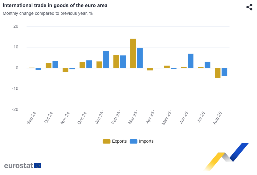 CdM | Las primeras estimaciones de la balanza de la zona del euro mostraron un superávit de 1.000 millones de euros en el comercio de bienes con el resto del mundo en agosto de 2025, frente a los 3.000 millones de euros de agosto de 2024.