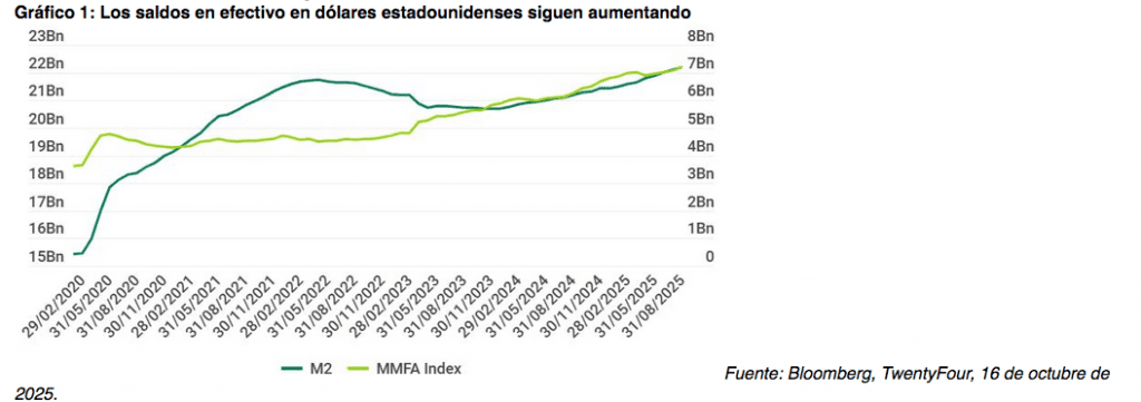 En primer lugar, los saldos del mercado monetario estadounidense han seguido creciendo, lo que indica que el proverbio «T-Bill and Chill» (bonos del Tesoro y tranquilidad) sigue vigente. Más recientemente, el M2 —que incluye efectivo y depósitos en cuentas corrientes, además de cuentas de ahorro, cuentas del mercado monetario y depósitos a plazo fijo por debajo de una determinada cantidad— ha vuelto a superar el máximo alcanzado en 2022. Parte del aumento de los saldos del mercado monetario se debe simplemente al mayor tamaño de la economía, pero, a pesar de esa dinámica, la tendencia es claramente hacia saldos más elevados similares al efectivo.