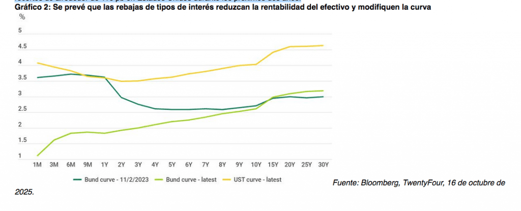 De cara al futuro, y en lo que respecta al mercado del dólar estadounidense, la forma actual de la curva de rendimiento no difiere mucho de la curva del Bund de hace dos años, un periodo que siguió a una serie de recortes de tipos por un total de 200 p.b.. En la actualidad, se prevén recortes de alrededor de 116 pb en Estados Unidos durante los próximos dos años.