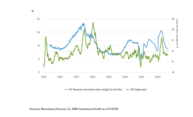 Nuestro gráfico de la semana compara las reservas de bonos del Tesoro estadounidense de la Fed como porcentaje del mercado total con el índice de precios al consumo (IPC) de EE. UU. Los grandes aumentos en la huella de la Fed tendieron a coincidir con períodos en los que la inflación se convirtió, a posteriori, en un problema mayor, sobre todo en la década de 1970 y de nuevo tras la pandemia. Eso no significa que el balance “provoca” cada repunte, pero es una herramienta que puede amplificar lo que la política fiscal y las perturbaciones de la oferta ya han puesto en marcha.