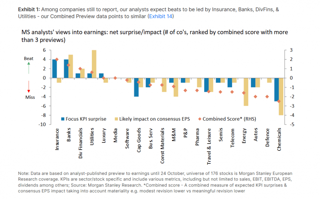 Morgan Stanley | Casi el 48% del market cap europeo ya ha publicado resultados con un sesgo neto del +22% hacia sorpresas positivas. Sin embargo, el impacto en las revisiones de BPA a 12M se mantiene equilibrado con un sesgo neto de +4% similar a 2Q. Los sectores con impacto positivo en BPA tras resultados son Lujo, Bancos, DivFins y Utilities.