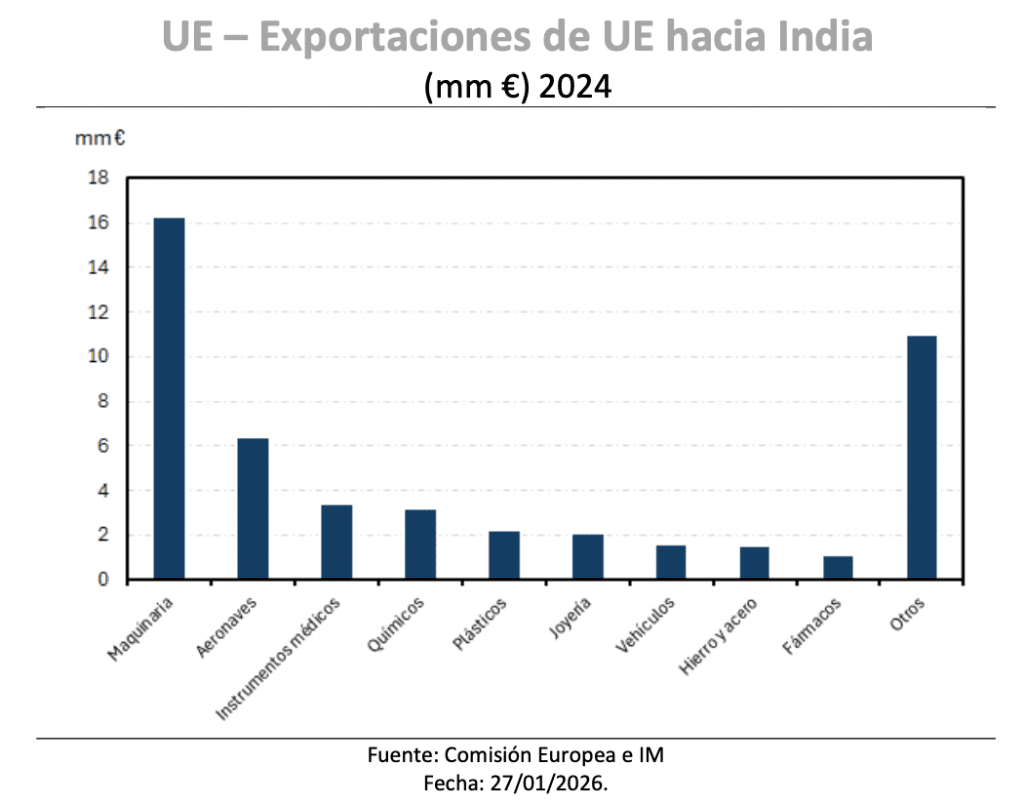 Así ha sucedido también con la Unión Europea, que ha anunciado con la India la firma de un acuerdo de libre comercio cuyo aspecto más destacado será la eliminación o reducción de aranceles para más del 90% de los productos de la UE lo que, en base a las autoridades europeas, supondría un ahorro anual que rondaría los 5 mm. €. Según la propia Comisión, el acuerdo duplique las exportaciones de bienes de la UE a India para 2032 desde los cerca de 50.000 mill. de euros actuales. Como ejemplo, los aranceles sobre los automóviles europeos experimentarán una progresiva reducción que pasará del 110% al 10% para 250.000 unidades mientras las bebidas espirituosas se reducirán desde el 150 al 40%. También se suprimirán por completo las tarifas sobre la maquinaria y equipos eléctricos desde el 44% de tarifa aplicada actualmente, así como aeronaves (actualmente en el 11%) alimentos procesados (30%) o aceite de oliva (45%), los productos químicos (22%) y los farmacéuticos (11%).