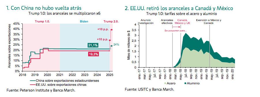impuestos propios de los países como el IVA, para calcular el arancel “óptimo”. Por ello, de cara a lo que pueda ocurrir la próxima semana, es fundamental tener una cierta perspectiva de lo que sucedió en el Trump 1.0., ya que algunas de las medidas que inicialmente anunció no se terminaron aplicando o terminaron retirándose. La guerra tarifaria del primer mandato se puede clasificar en tres grandes bloques: