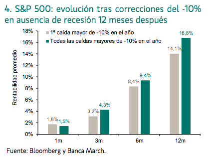 forma que las ventas comenzaron con las sorprendentes palabras de Trump, el origen de los rebotes del S&P 500 será igual de caprichoso y de naturaleza impredecible. Como muestra el gráfico, tras caídas del -10% y en ausencia de recesión, lo normal es que el mercado rebote. A pesar del retador panorama, ante un ciclo que no descarrilará, toca mantener el paso firme y, como valientes mosqueteros, desenfundar la espada para seguir luchando.