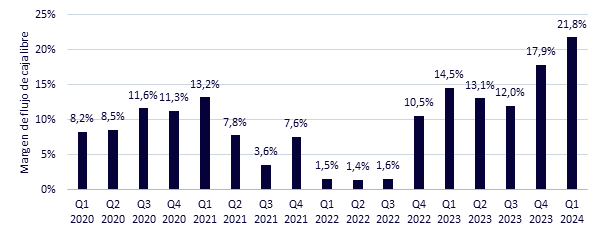 Si nos fijamos en el Gráfico 2, el margen mediano de Flujo de Caja Libre ha pasado del 0,9 % en el tercer trimestre de 2021 (el periodo de máximo crecimiento medio de los ingresos observado en el Gráfico 1) a un nivel del 21,7 % en el primer trimestre de 2024.