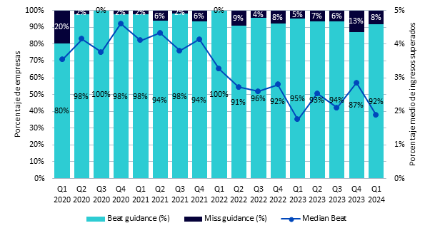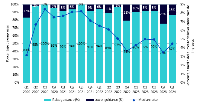 Las cifras indican un poco más de movimiento, por ejemplo, en el cuarto trimestre de 2023, vimos que el porcentaje de aumento de las orientaciones pasó del 92 % al 75 %. También vemos cómo la mediana del aumento de las orientaciones de ingresos ha pasado del rango del 7-8 % a algo más cercano al 4-5 %.