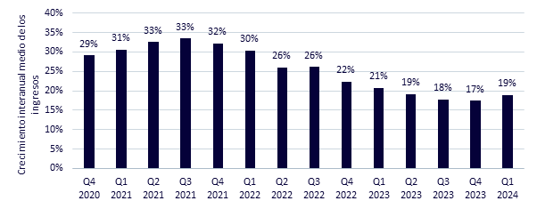 ·       El crecimiento medio de los ingresos se aceleró en el tercer trimestre de 2021. Después de ese punto, entró en una tendencia de desaceleración, cayendo de alrededor del 33 % a un mínimo del 17 %, observado en el cuarto trimestre de 2023.
