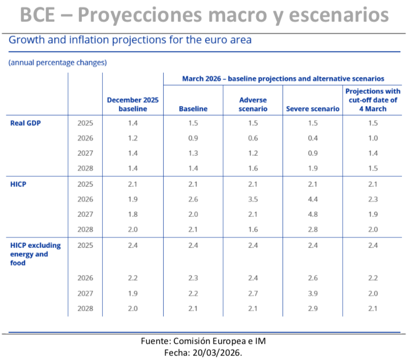 Cómo era natural, el BCE moderaba las estimaciones de crecimiento. Las proyecciones de referencia prevén un crecimiento anual del PIB del 0,9% en 2026, del 1,3% en 2027 y del 1,4% en 2028. En contraste con las proyecciones realizadas en diciembre se revisaban a la baja en 0,3 p.p y 0,1 p.p las previsiones de crecimiento del presente año y del próximo, dejando sin cambios la de 2028. La otra pata era la inflación, la cual, obviamente, se revisaba al alza aumentando hasta el 3,1% antes de descender al 2,0% en 2027 y luego subir al 2,1% en 2028. Esto supone una subida de 0,7 p.p para el año actual y de 0,2 p.p en 2027.