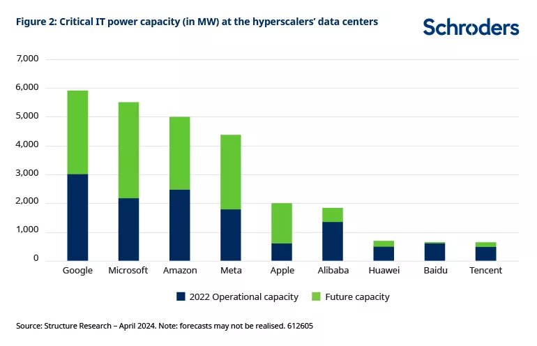 Las mayores empresas tecnológicas del mundo están invirtiendo miles de millones de dólares en añadir capacidad energética crítica para aumentar su capacidad de entrenar y desarrollar modelos de IA. Entre estas empresas -conocidas como «hiperescaladoras» por su capacidad para escalar la infraestructura informática a niveles que puedan acomodar la demanda masiva de servicios de computación en la nube, almacenamiento de datos y ahora capacidades de IA- se incluyen Google, Microsoft, Amazon, Meta (Facebook), Apple y Alibaba.