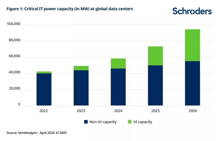 Mannat Chopra & Alex Monk (Schroders) | El aumento del uso de la IA exigirá un mayor desarrollo de los centros de datos e incrementará enormemente el consumo de electricidad. Las energías renovables pueden proporcionar gran parte de la energía necesaria, pero seguirán haciendo falta fuentes a demanda como el gas natural, dada la intermitencia en el suministro de energía eólica y solar.