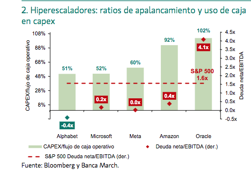 Hoy en día, la inversión agregada supone un 27% del flujo de caja mientras que, en el año 2000, llegó a alcanzar el 90%. Asimismo, es fundamental tener en cuenta que las actuales inversiones se están abordando con mucha menos deuda que en el pasado. Dentro de los hiperescaladores –grandes proveedores globales de servicios y computación en la nube– hay compañías como Alphabet que, aunque están destinando a inversión la mitad de su flujo de caja, no tienen deuda neta. Otros, como Microsoft, Meta o incluso Amazon tienen una deuda neta contenida respecto a sus beneficios que se sitúa ampliamente por debajo de las 1,6x del promedio de compañías que componen el S&P 500.