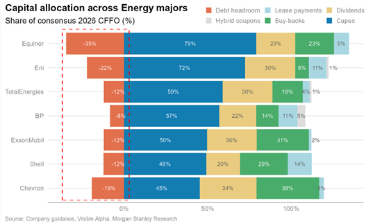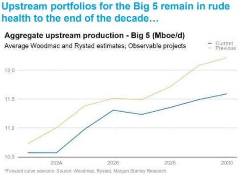 Morgan Stanley | Nuestro analista Martijn Rats repasa el sector de petroleras en Europa, profundizando sobre todo en los activos de generación (analizando cerca de 4.000 activos O&G y unos 1.000 proyectos en renovables) y en los pipelines de las majors, para valorar su capacidad de gestionar su balance dadas las expectativas de debilidad en el precio del Brent en el corto plazo (60$/bbl en 1T26). El análisis bottom-up concluye que las carteras de exploración y producción (upstream) de las grandes petroleras siguen siendo muy sólidas, con visibilidad clara sobre el crecimiento de la producción de petróleo y gas hasta 2030. Al mismo tiempo, se espera que la generación de energía renovable siga creciendo los próximos años, pero es cierto que los planes de capex han vuelto a caer, en línea con la tendencia descendente que hemos podido ver los últimos años.