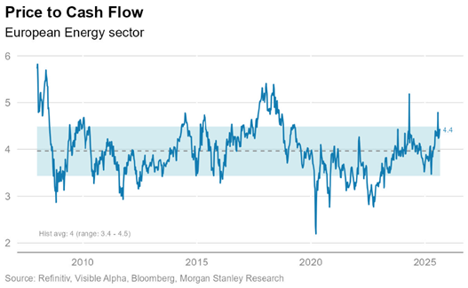 La conclusión del equipo es mantener una recomendación de cautela para el sector, ya que los precios de petróleo y gas se mantienen como principal driver para las revisiones de beneficios, algo para lo que el equipo tiene perspectivas bajistas, dado el superávit en el suministro esperado para el 2S26. Con esta perspectiva de precios de commodities, los analistas ven RIESGO BAJISTA EN LAS CIFRAS DE BUYBACKS del sector, ya que el Flujo de Caja Operativo estimado del año 2026 del consenso no es suficiente para cubrir las estimaciones de capex, distribuciones y otras salidas de cash, generando así presión en los balances del sector. Lo curioso es que el sector ha visto un re-rating hasta la parte alta del rango, en 4.4x Flujo de Caja Operativo en un entorno de con deterioro de fundamentales, algo que no genera confianza a los analistas, salvo que veamos repuntes en el precio del Brent. El equipo estima que los majors van a poder ofrecer un FCF yield de sólo 4,4% en 2026.