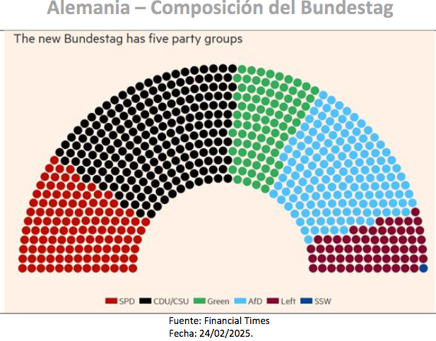 Intermoney | La ola de polarización política que llevamos años viendo en Europa hizo también su aparición en las elecciones generales en Alemania el pasado domingo, aunque con unos posibles escenarios de acuerdo más sencillos que los que hemos presenciado en otros países. Los socialdemócratas del SPD fueron los más castigados y se enfrentarán a mayores dificultades tras haber obtenido su peor resultado histórico (16%). Los democristianos del CDU/CSU de Merz, a pesar de la victoria, no lograron un resultado boyante pues cosecharon su segundo peor escrutinio histórico (28%), mientras que los liberales del FDP ni siquiera llegan al 5% necesario para entrar al parlamento.