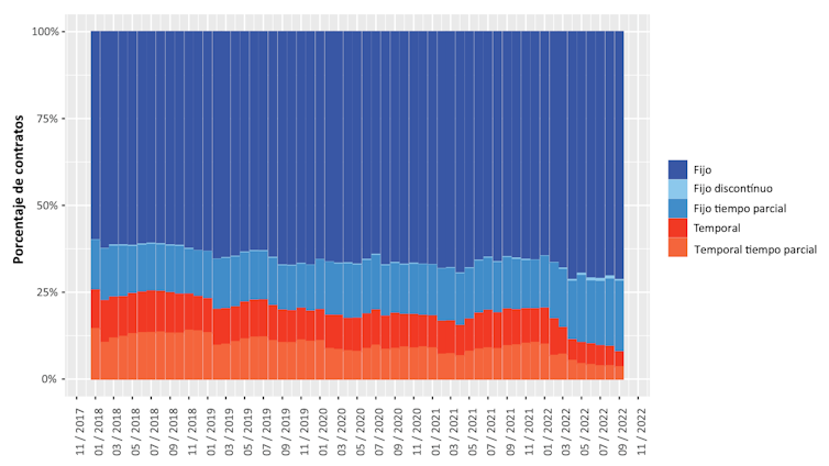 Mientras que de 2018 a 2021 el 90 % de los nuevos contratos firmados eran temporales, en septiembre de 2022 los nuevos contratos fijos representaban casi el 70 % de las altas, con una tendencia creciente. Si bien estos contratos son ahora más frecuentes, muestran una duración media menor a la de antes de la reforma.