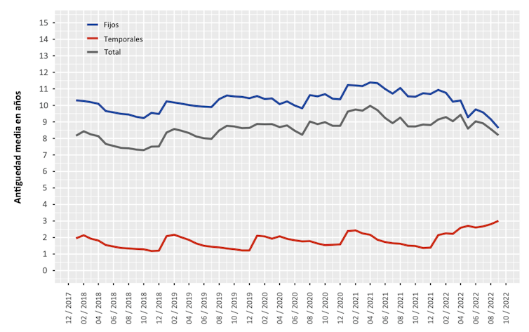 Los datos muestran un proceso de convergencia en la duración media de los contratos. La antigüedad media de los temporales aumenta mientras que la de los contratos fijos se reduce, lo que lleva a una reducción de la duración media del total de los contratos. También que, durante 2021, la duración media de los contratos era de nueve años y dos meses. En 2022 (hasta septiembre) ha sido de menos de nueve años, con tendencia a la baja.